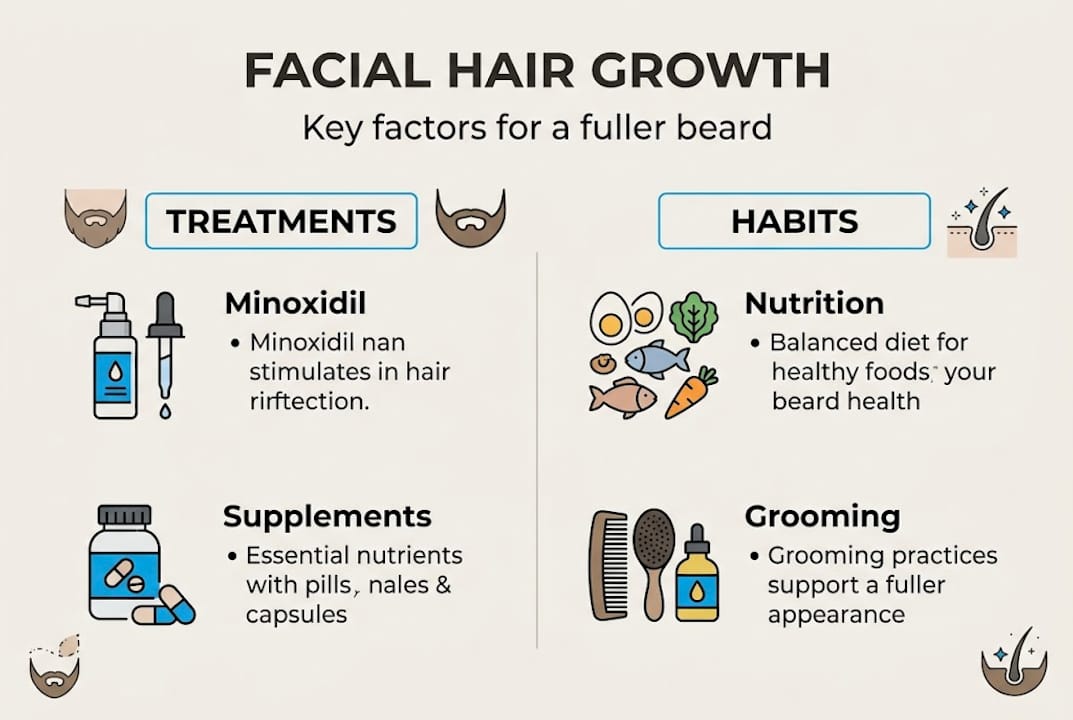 Consistent skin cleansing, daily moisturizing, adequate dietary protein and zinc, regular exfoliation, and proper beard grooming all create the physical and nutritional conditions that support healthy, visible facial hair growth.