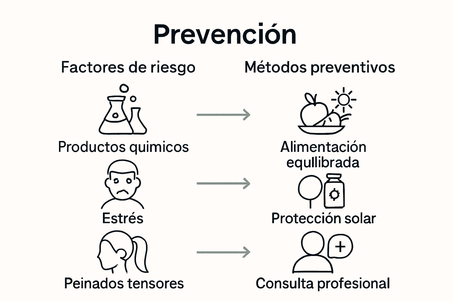 La prevención incluye mantener una dieta equilibrada, reducir el estrés, proteger el cabello de tratamientos agresivos y realizar revisiones periódicas con especialistas para una evaluación adecuada.