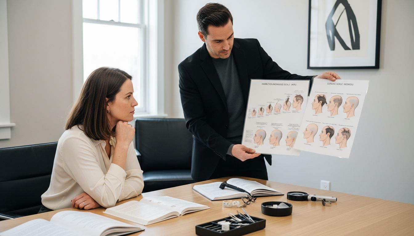 En hombres, sigue típicamente la escala de Norwood, mientras que en mujeres se utiliza la clasificación de Ludwig. Cada etapa representa un avance en la pérdida capilar, desde un adelgazamiento casi imperceptible hasta una calvicie más pronunciada.