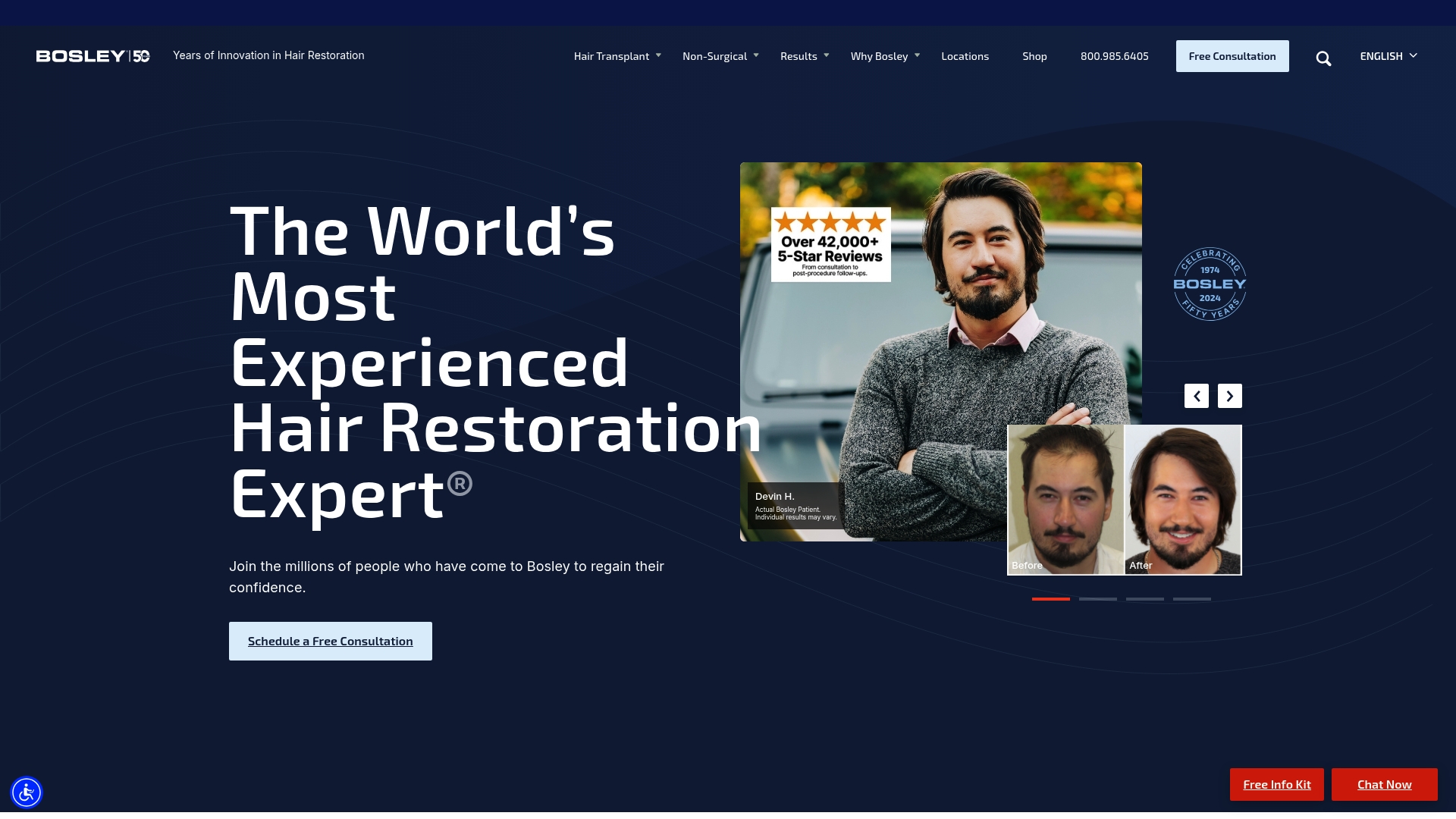 Bosley offre des solutions complètes de restauration capillaire avec plus de 50 ans d'expérience et des options chirurgicales et non chirurgicales sous un même toit. Le résultat est une prise en charge personnalisée accessible dans plusieurs cliniques à travers le pays.