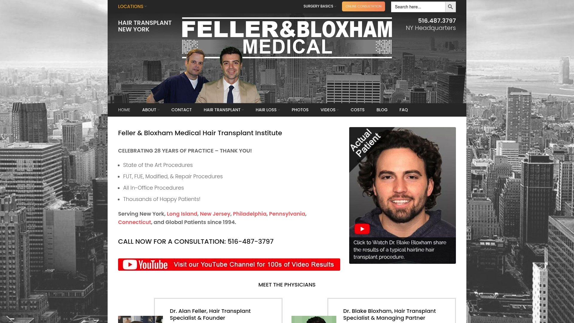 Un patient de New York consulte avec Dr. Feller ou Dr. Bloxham, reçoit une évaluation personnalisée et subit une procédure FUT ou FUE en cabinet. Le suivi et les photos avant-après illustrent l’évolution et servent de ressource pour futurs patients.