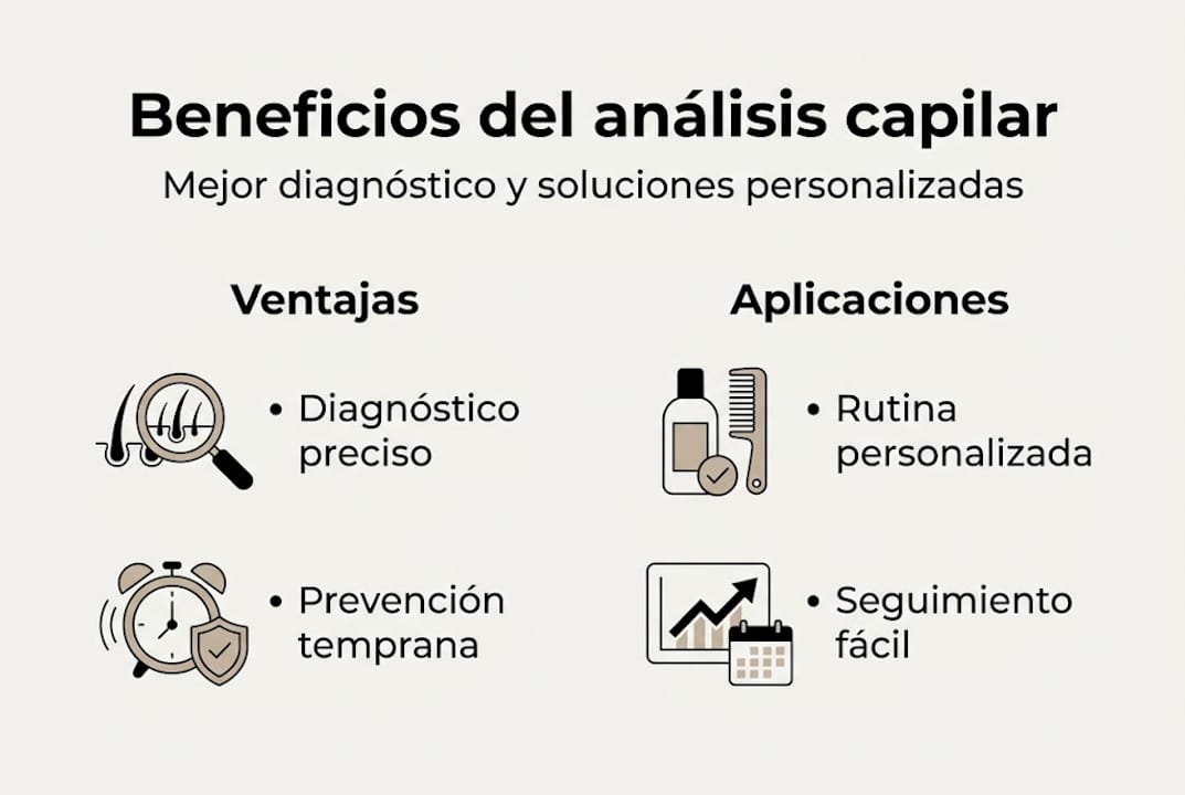 Detecta causas ocultas, permite un seguimiento preciso y objetivo, y la tricoscopia reduce biopsias al mejorar la detección diagnóstica sin procedimientos invasivos.