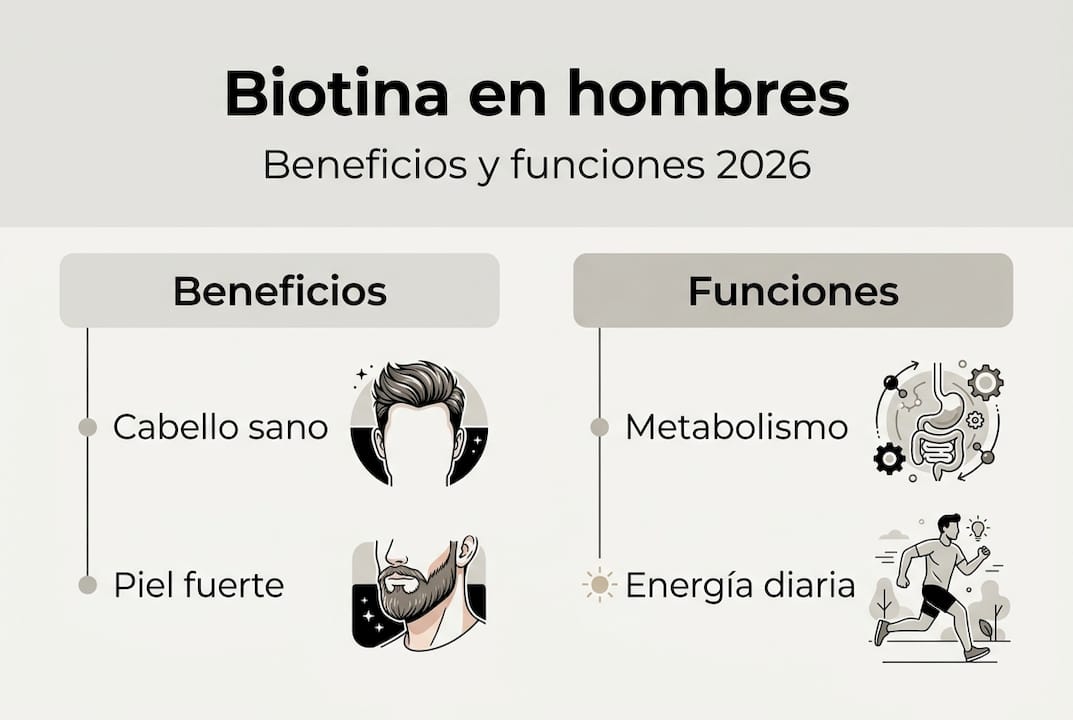 No, la biotina no previene ni trata la alopecia androgenética, la forma más común de calvicie en hombres. Esta condición resulta de factores hormonales y genéticos que la biotina no puede modificar. Solo mejora el cabello cuando existe deficiencia confirmada de la vitamina.