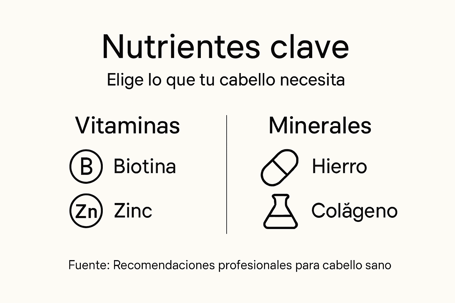 Los nutrientes específicos pueden fortalecer diferentes aspectos de tu salud capilar de manera estratégica. Cada suplemento debe ser una solución dirigida a tus deficiencias particulares.