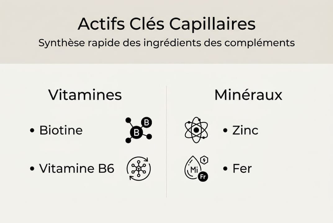 Les principaux actifs que vous retrouverez dans la majorité des formules sont la biotine, le zinc, les vitamines B (B6, B12), le fer, la kératine hydrolysée et certains extraits végétaux comme le saw palmetto. Chacun joue un rôle distinct. La biotine soutient la production de kératine. Le zinc régule les glandes sébacées. Le fer transporte l'oxygène jusqu'au bulbe. La kératine hydrolysée renforce la fibre capillaire directement.