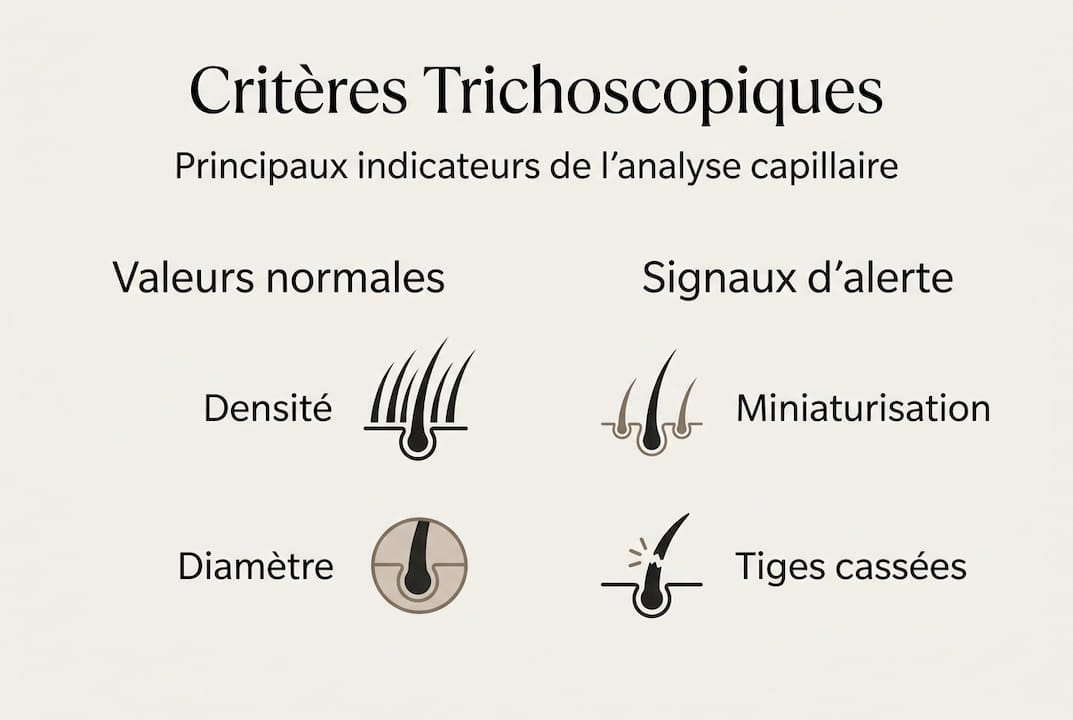 Ce score intègre densité, diamètre, état folliculaire et taux de miniaturisation. TrichoScan combine microscopie d'épiluminescence et analyse d'images digitales pour mesurer précisément ces paramètres et les comparer à des valeurs de référence cliniques.