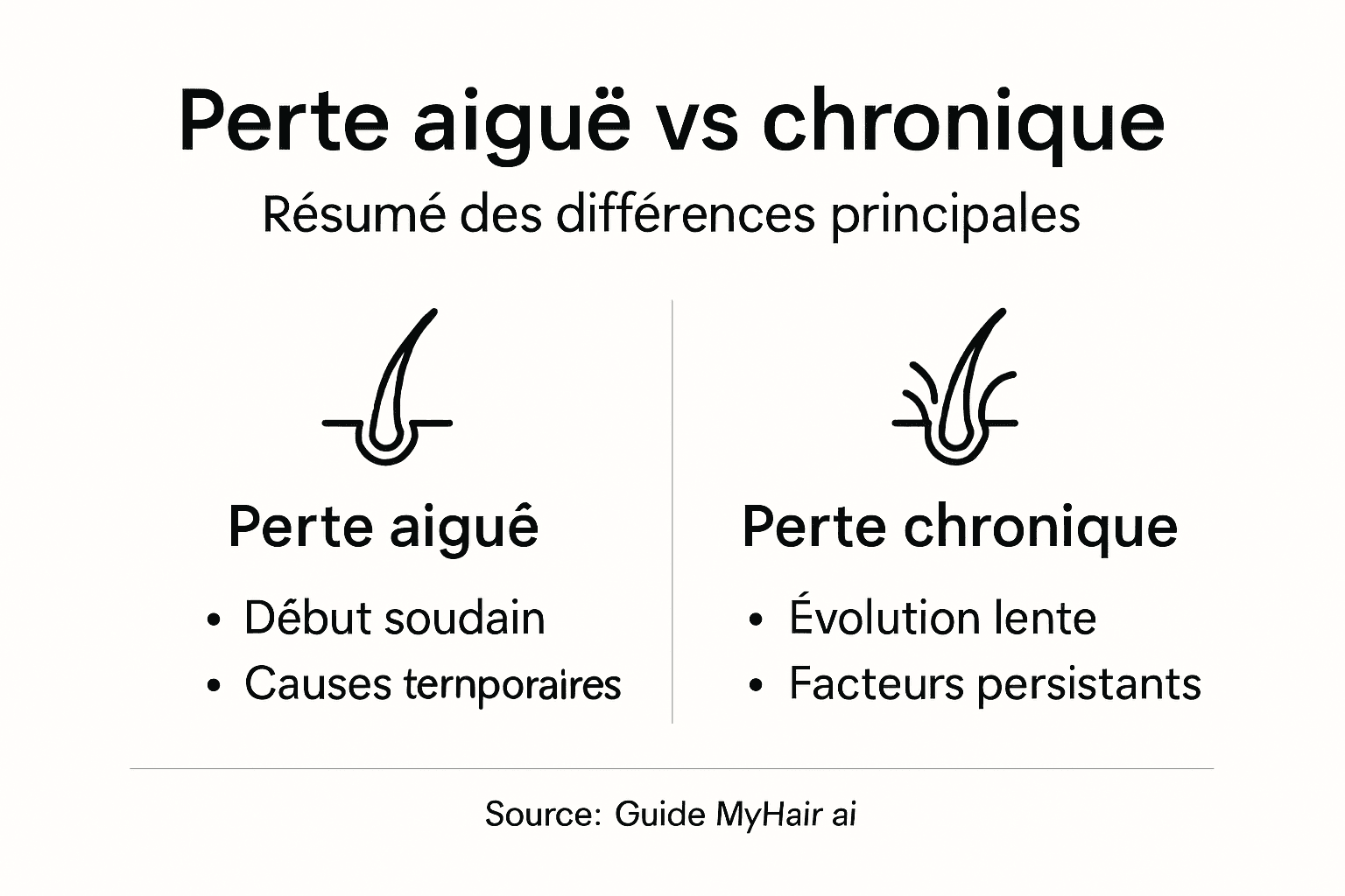 Voici un tableau comparatif des différences majeures entre la perte de cheveux aiguë et chronique :