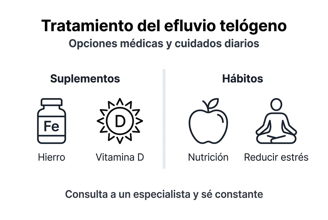 Los tratamientos médicos incluyen suplementos de hierro para deficiencias comprobadas, vitamina D si los niveles están bajos, y en algunos casos, minoxidil tópico para estimular el crecimiento. Sin embargo, estos deben prescribirse individualmente después de evaluación completa.