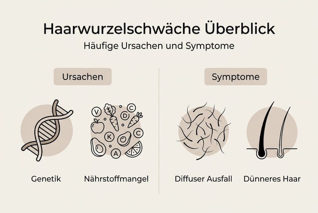 | Haarwurzelschwäche erkennen | Anhaltender, diffuser Ausfall und dünneres Haar sind erste Warnzeichen. |