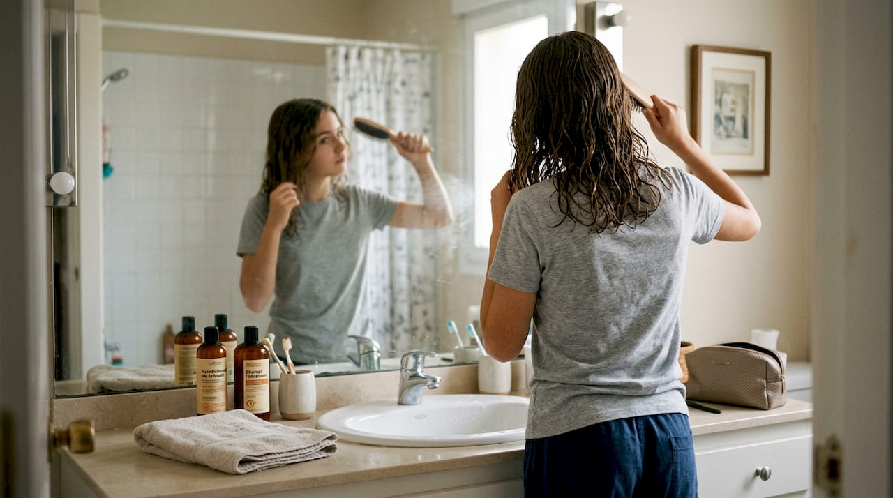 La solución es más sencilla de lo que parece. Usa una toalla de microfibra o una camiseta de algodón suave para absorber el exceso de agua con movimientos envolventes, sin frotar. Luego, aplica un acondicionador sin aclarado y desenreda con un peine de dientes anchos empezando por las puntas. Aprender a proteger el cabello al dormir también empieza por asegurarte de que no va a la cama húmedo ni enredado.