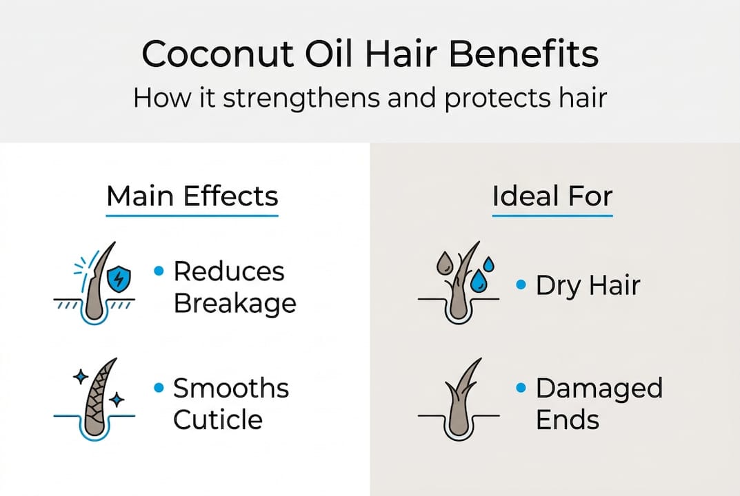 Coconut oil does not cause new hair growth or reverse baldness. It reduces breakage and protects hair shafts, which can make existing hair look fuller, but it cannot reactivate dormant follicles or counter the hormonal causes of pattern hair loss.