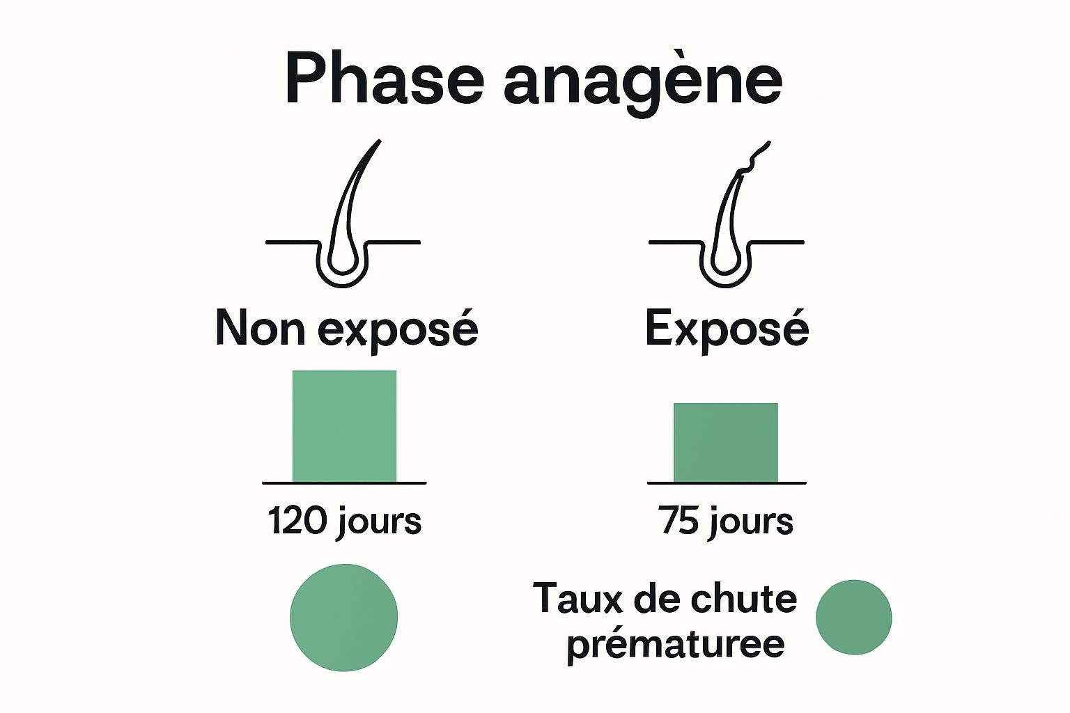 Les polluants interfèrent directement avec le cycle de vie normal des cheveux. Chaque follicule pileux traverse trois phases principales : anagène (croissance), catagène (transition) et télogène (repos). Les particules toxiques peuvent bloquer ou ralentir ces étapes essentielles, empêchant les cheveux d'atteindre leur plein potentiel de croissance.