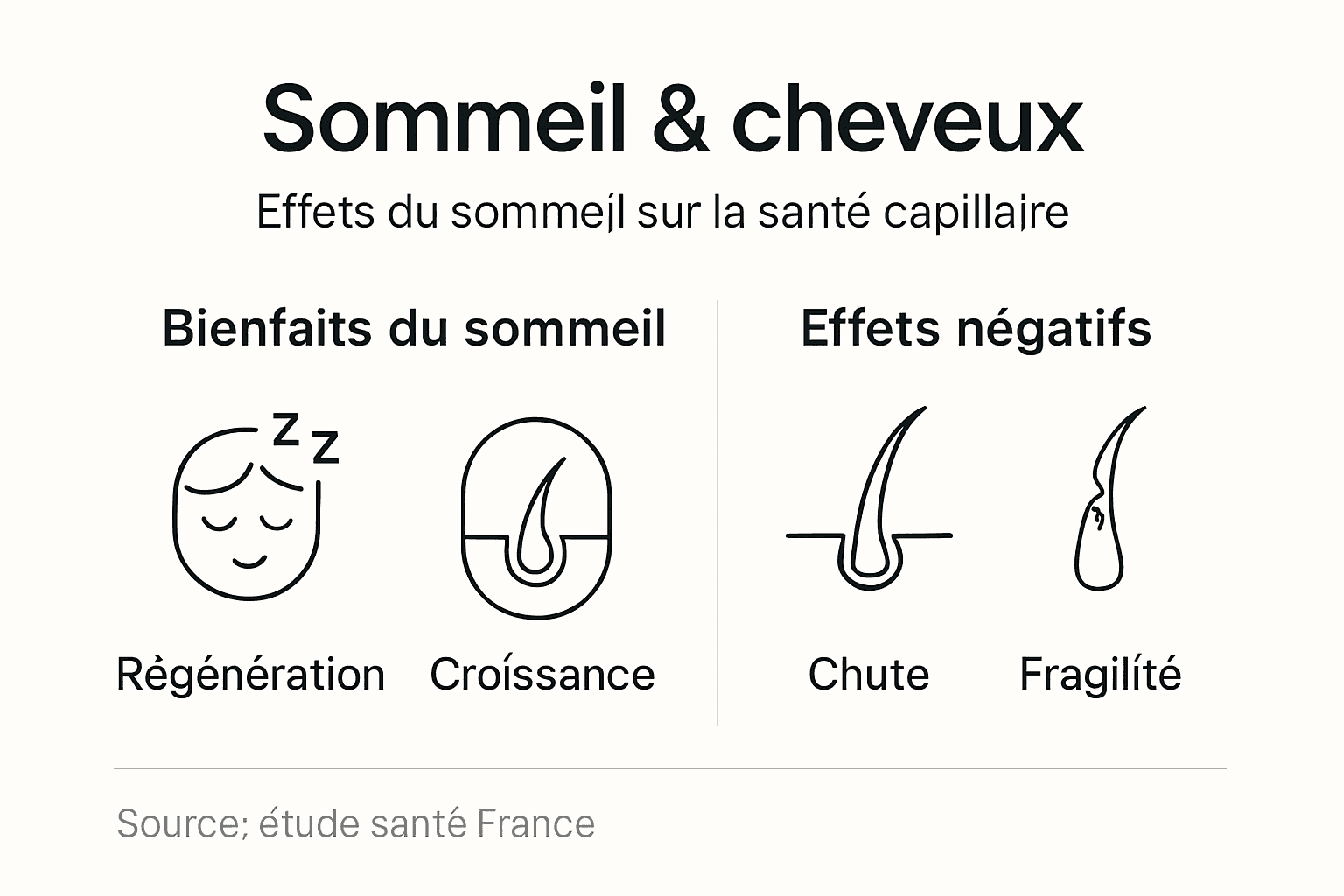 | Impact hormonal | Le manque de sommeil augmente le cortisol, hormone qui double la chute des cheveux. |