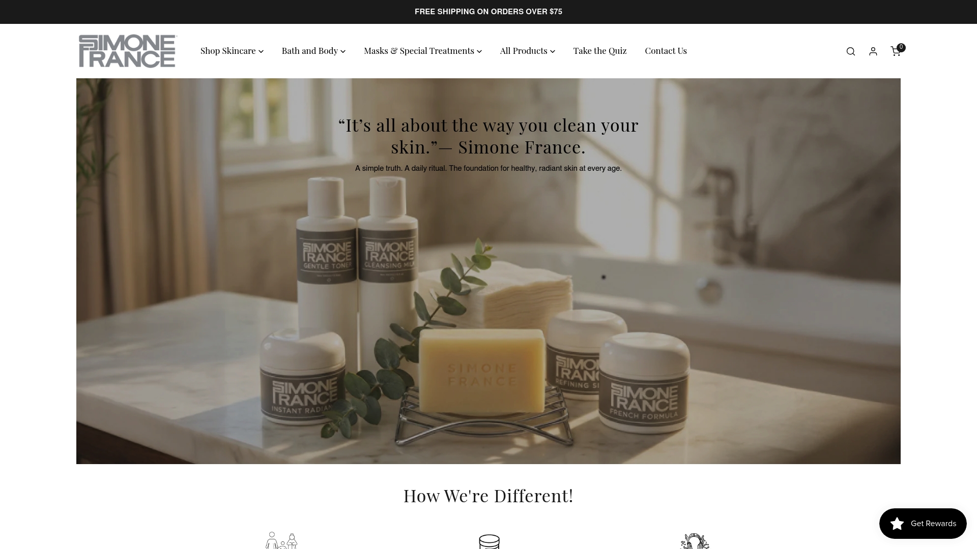 Simone France se distingue par l'absence de nettoyants liquides ou gels au profit de textures crémeuses, mousseuses et soyeuses qui favorisent un massage doux. La marque enseigne une méthode de nettoyage propriétaire, conçue pour être faite rapidement matin et soir, et revendique une compatibilité avec tous les types et âges de peau. L'offre reste centrée sur le nettoyage et les soins basiques (savons, masques, kits), portée par un héritage familial et l'expertise d'une fondatrice reconnue.