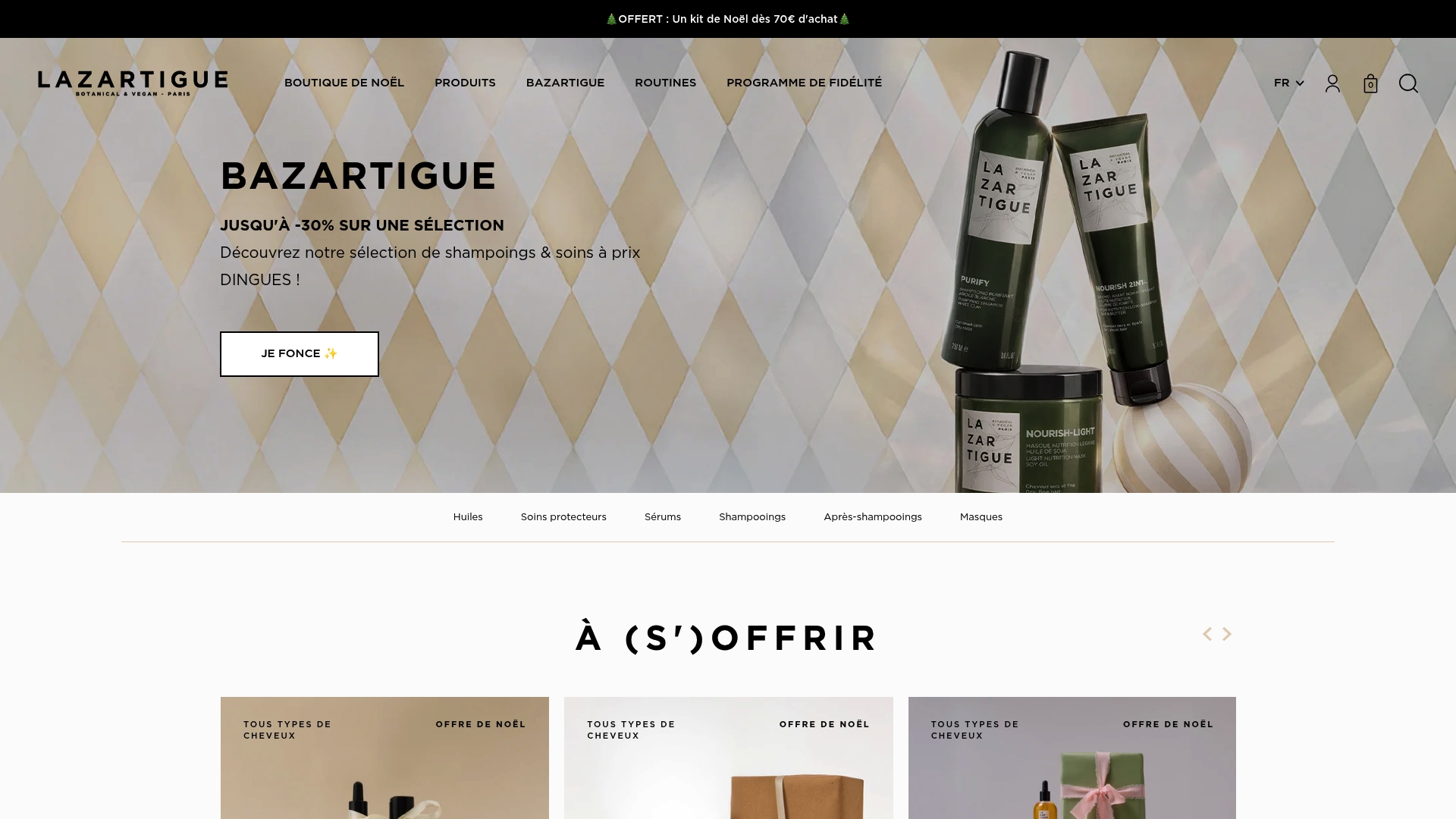 Lazartigue offre des formulations vegan à base d'ingrédients botaniques, une fabrication localisée en France, et une vaste sélection de produits : shampoings, après-shampoings, masques, sérums, huiles et produits colorants. La marque met aussi en avant des offres saisonnières — notamment des coffrets cadeaux à destination des achats de Noël — et des options de livraison gratuite selon le montant de la commande. L'accent est clairement mis sur la diversité de l'offre pour répondre à des préoccupations variées : protection de la couleur, volume, sensibilité du cuir chevelu et entretien quotidien.