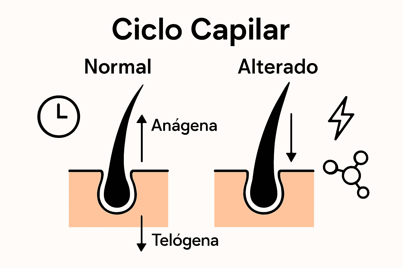 | Estrés | El estrés eleva los niveles de cortisol, afectando negativamente el crecimiento capilar y provocando efluvio telógeno. |