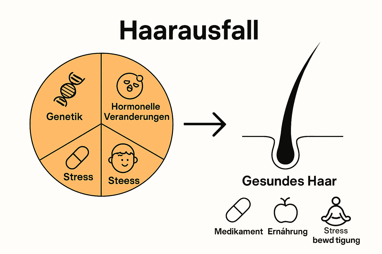 | Telogenes Effluvium | Stress<br>Krankheit | Diffuser Haarausfall | Stressreduktion<br>Behandlung der Ursache |