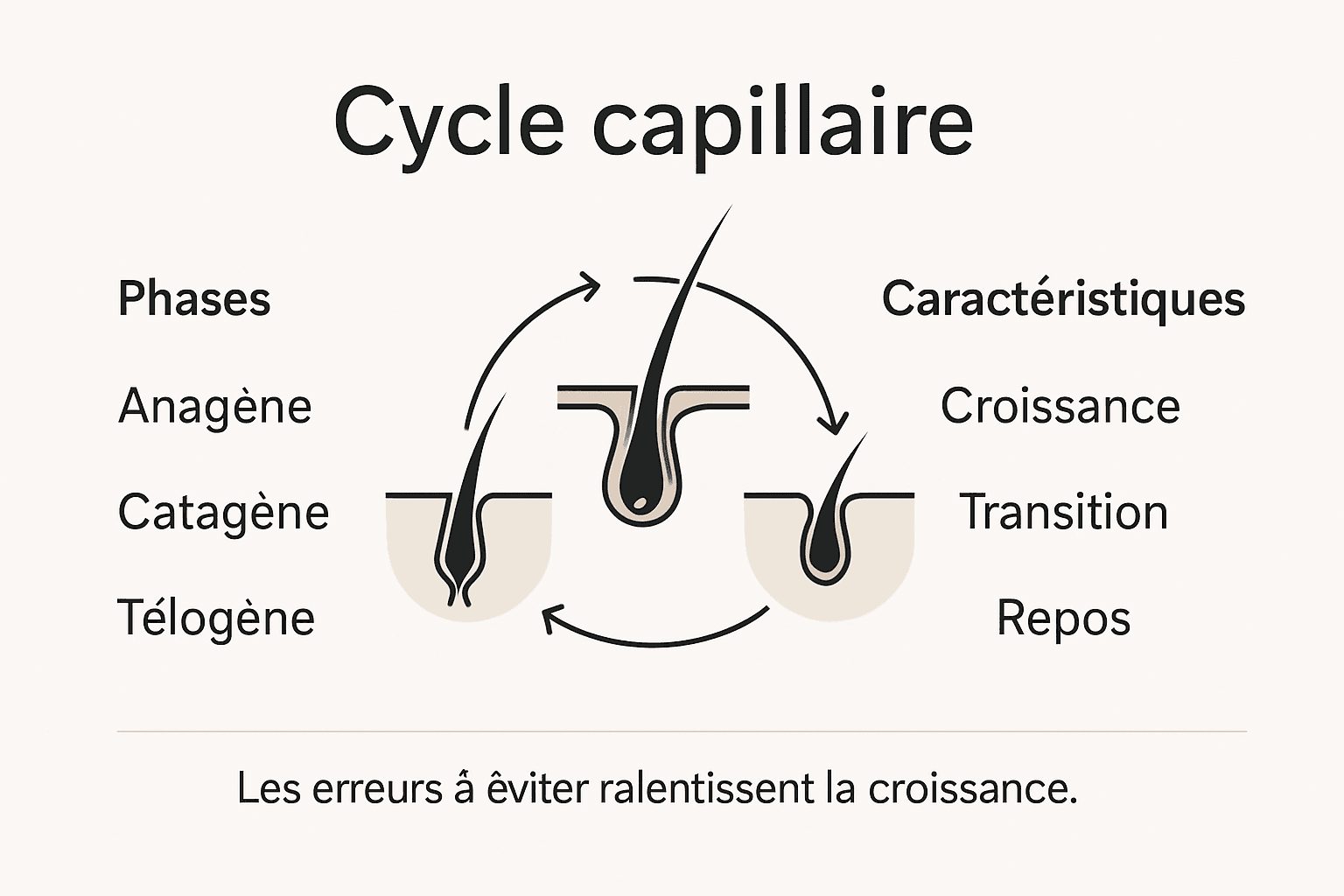 | Cycle Capillaire | Le cycle de repousse des cheveux comporte trois phases : anagène, catagène et télogène, permettant une compréhension fondamentale de la croissance capillaire. |