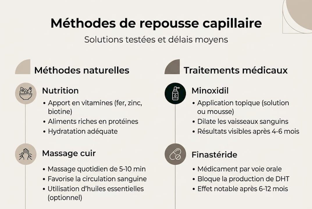 | Méthodes validées | Minoxidil, finastéride, micro-needling et nutrition adaptée sont les solutions les plus efficaces selon la science. |